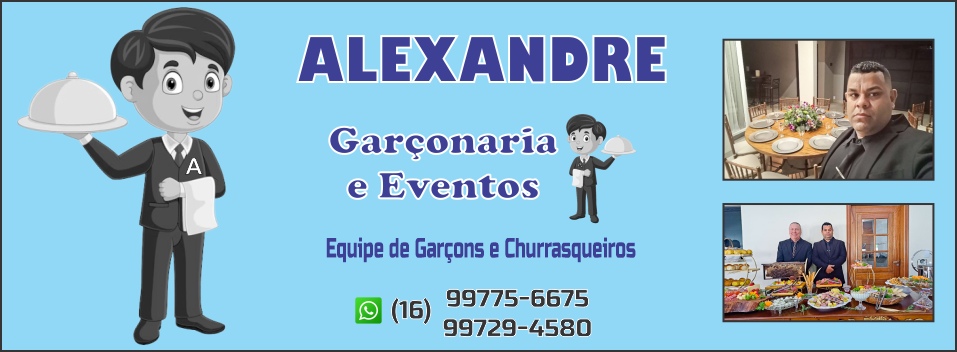 Alexandre Garçonaria e Eventos, atende Araraquara e região, conta com capacitada equipe de garçons e churrasqueiros e atende todos os tipos de eventos ( Festas de Casamento, Bodas, 15 anos, aniversários de adulto e infantis, Confraternizações de amigos e Eventos Corporativos., etc. Estamos à disposição para servír.